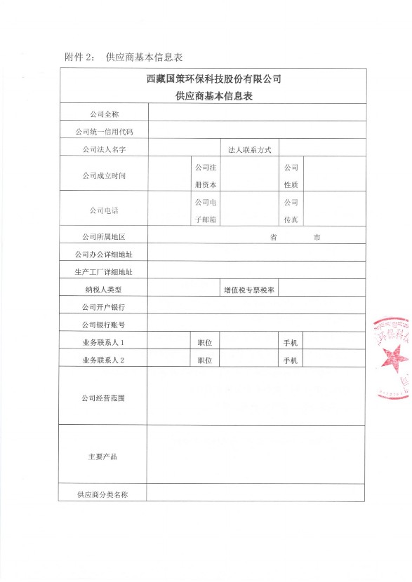 供應(yīng)商將資料整理成冊(cè)并每頁(yè)蓋章后掃描為PDF文件,發(fā)送至西藏國(guó)策環(huán)保科技股份有限公司采購(gòu)郵箱:cg@guoce.com。