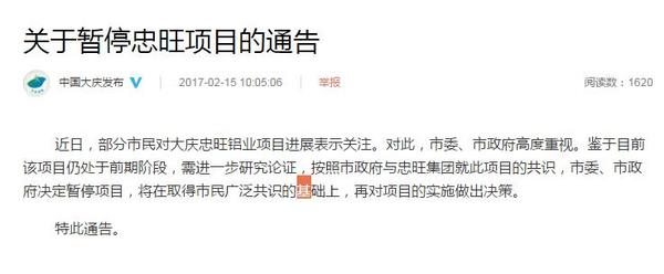 黑龍江大慶市委宣傳部官方微博今日發(fā)布《關(guān)于暫停忠旺項(xiàng)目的通告》稱,近日,部分市民對大慶忠旺鋁業(yè)項(xiàng)目進(jìn)展表示關(guān)注。對此,市委、市政府高度重視。鑒于目前該項(xiàng)目仍處于前期階段,需進(jìn)一步研究論證,按照市政府與忠旺集團(tuán)就此項(xiàng)目的共識,市委、市政府決定暫停項(xiàng)目,將在取得市民廣泛共識的基礎(chǔ)上,再對項(xiàng)目的實(shí)施做出決策。